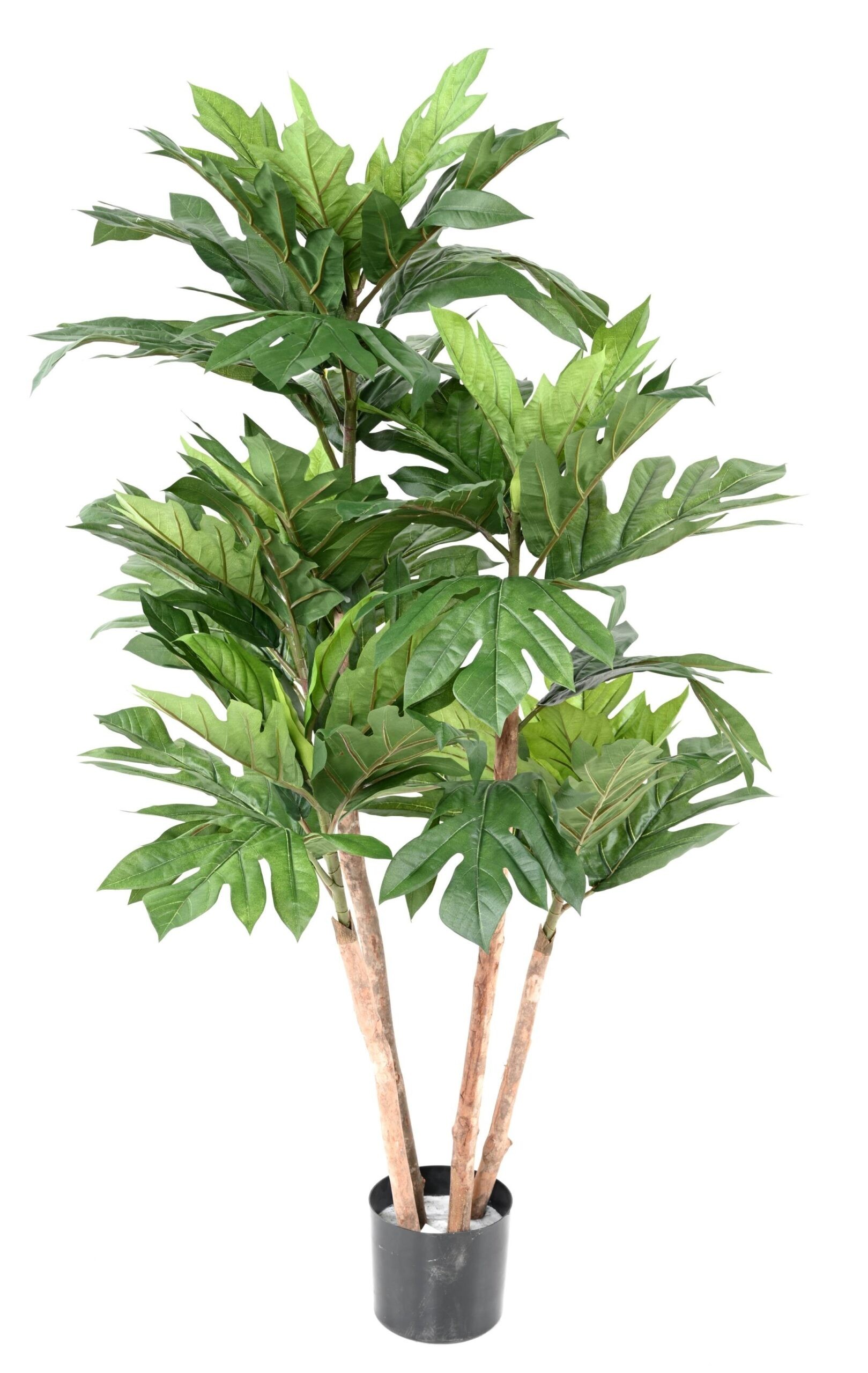 Der künstliche Brotfruchtbaum (Artocarpus altilis) ist eine beeindruckende Erscheinung, bekannt für sein grossflächiges, markantes Blattwerk. Ursprünglich aus den tropischen Regionen der Südsee stammend, bereichert dieser Baum mit seinem prächtigen grünen Blätterkleid jedes Zuhause um einen Hauch Exotik. Unsere naturgetreue Replik des Brotfruchtbaums besticht durch hochwertige textile Blätter in unterschiedlichen Dimensionen, die dem natürlichen Vorbild detailgetreu nachempfunden sind. Mit seiner stattlichen Höhe und der ausladenden Wuchsform wird dieser Baum zum zentralen Hingucker in jedem Raum.