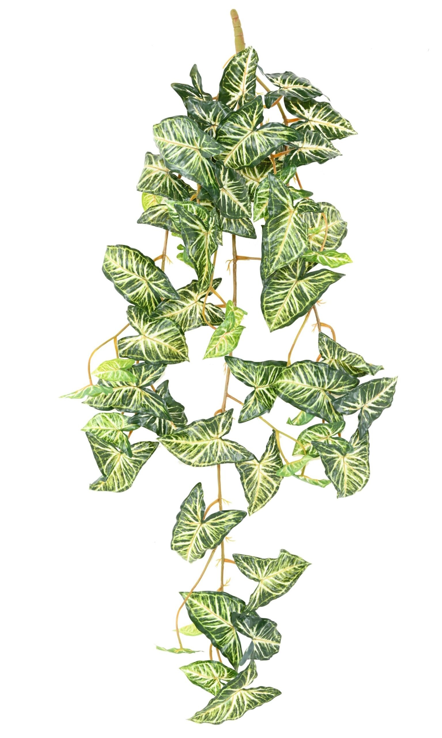 Entdecken Sie den künstlichen Syngonium Hänge-Busch, eine exquisite Dekorationspflanze, die mit ihrer naturgetreuen Erscheinung und absoluten Wartungsfreiheit überzeugt. Diese Kunstpflanze, die eine Höhe von etwa 110 cm und eine Breite von rund 45 cm aufweist, verleiht jedem Ambiente eine lebendige, grüne Note, ohne jeglichen Pflegebedarf.