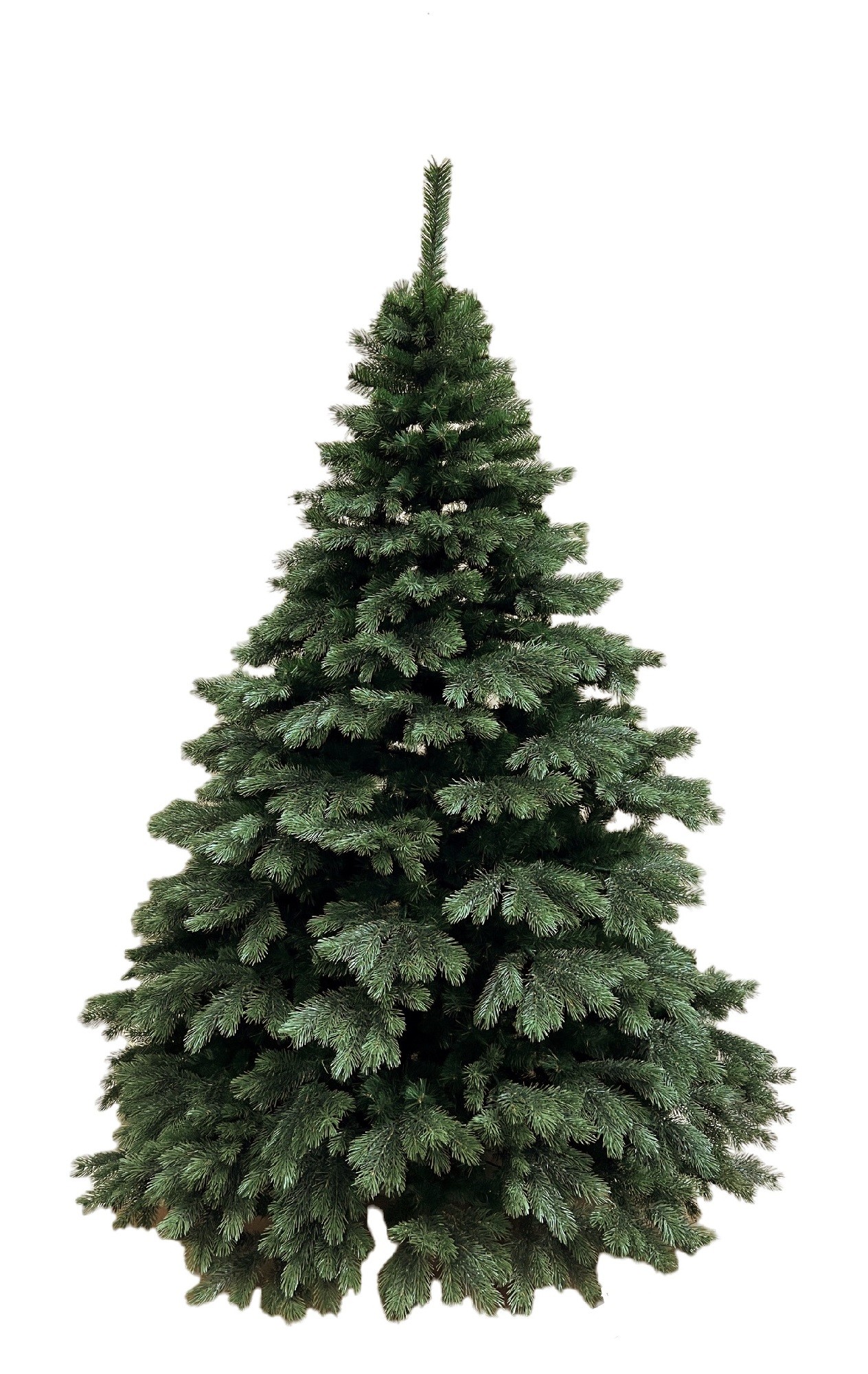 Dieser Baum zeichnet sich durch seinen authentischen PE/PVC-Materialmix aus. Die innere Baumkrone wird von klassischen PVC-Zweigen verdichtet, während die äusseren Zweigspitzen aus detailgetreu geformtem PE bestehen. Diese präsentieren sich in einem feinen Farbverlauf, der von einem tiefen Dunkelgrün zu einem lebendigen Mittelgrün übergeht. Dezente Brauntöne an den Zweigbasen runden das Bild ab und simulieren gekonnt den Look von natürlichem Holz.
