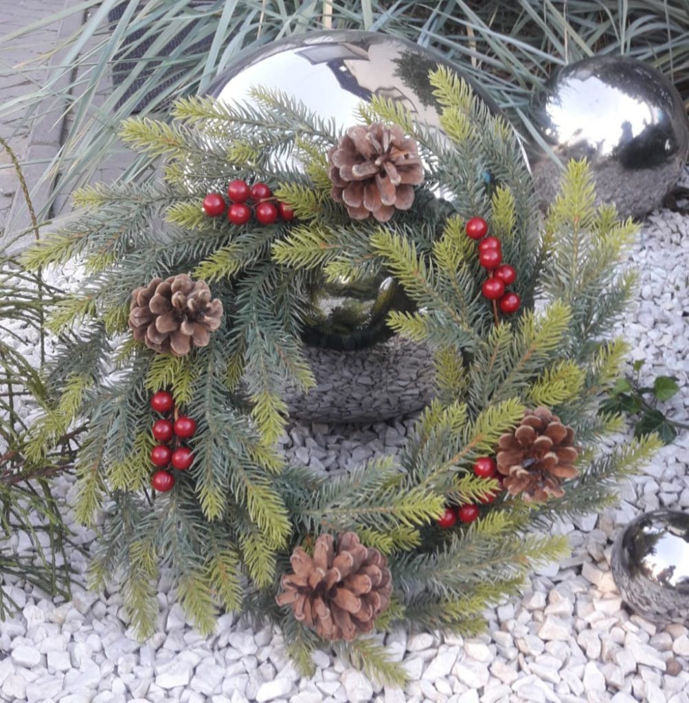 - Verzierungen: Kombination aus Kunststoff-Beeren und echten Zapfen.